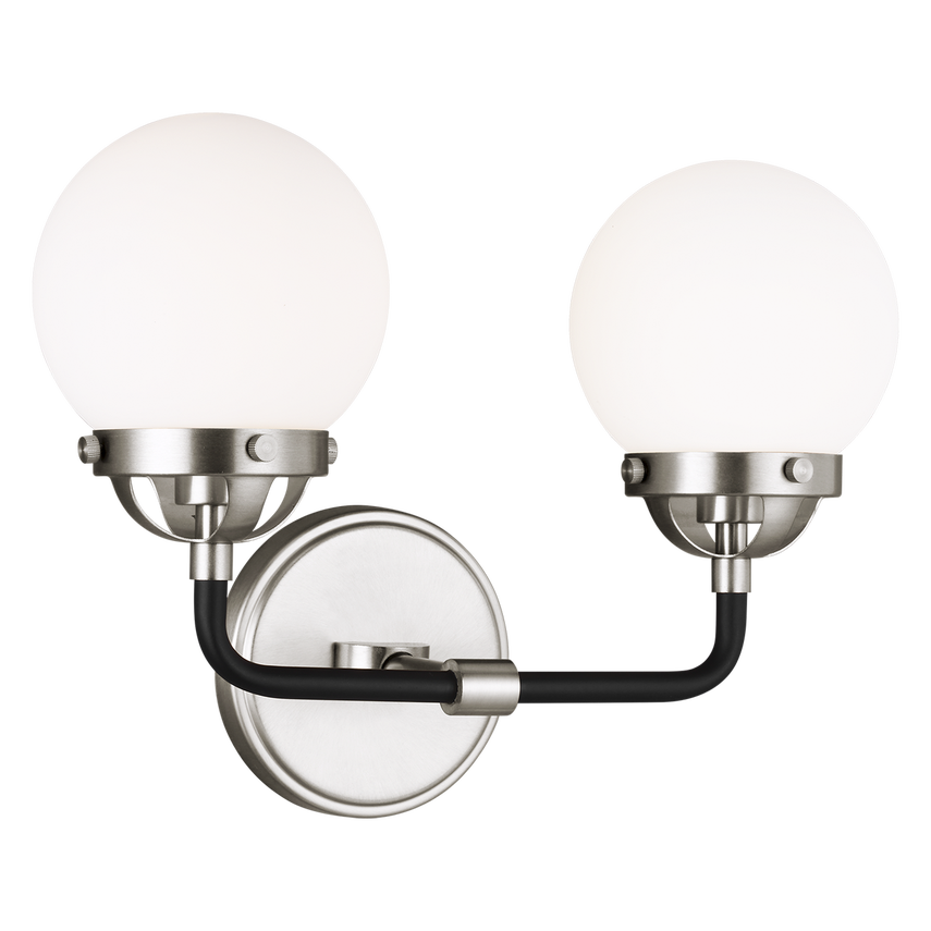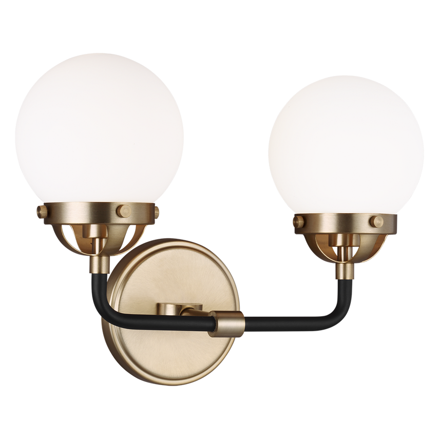Le luminaire de vanité à deux lumières Cafe en laiton satiné offre un éclairage sans ombre dans votre salle d'eau, votre spa ou votre salle de bain principale. Belle finition bicolore et abat-jour en verre blanc.