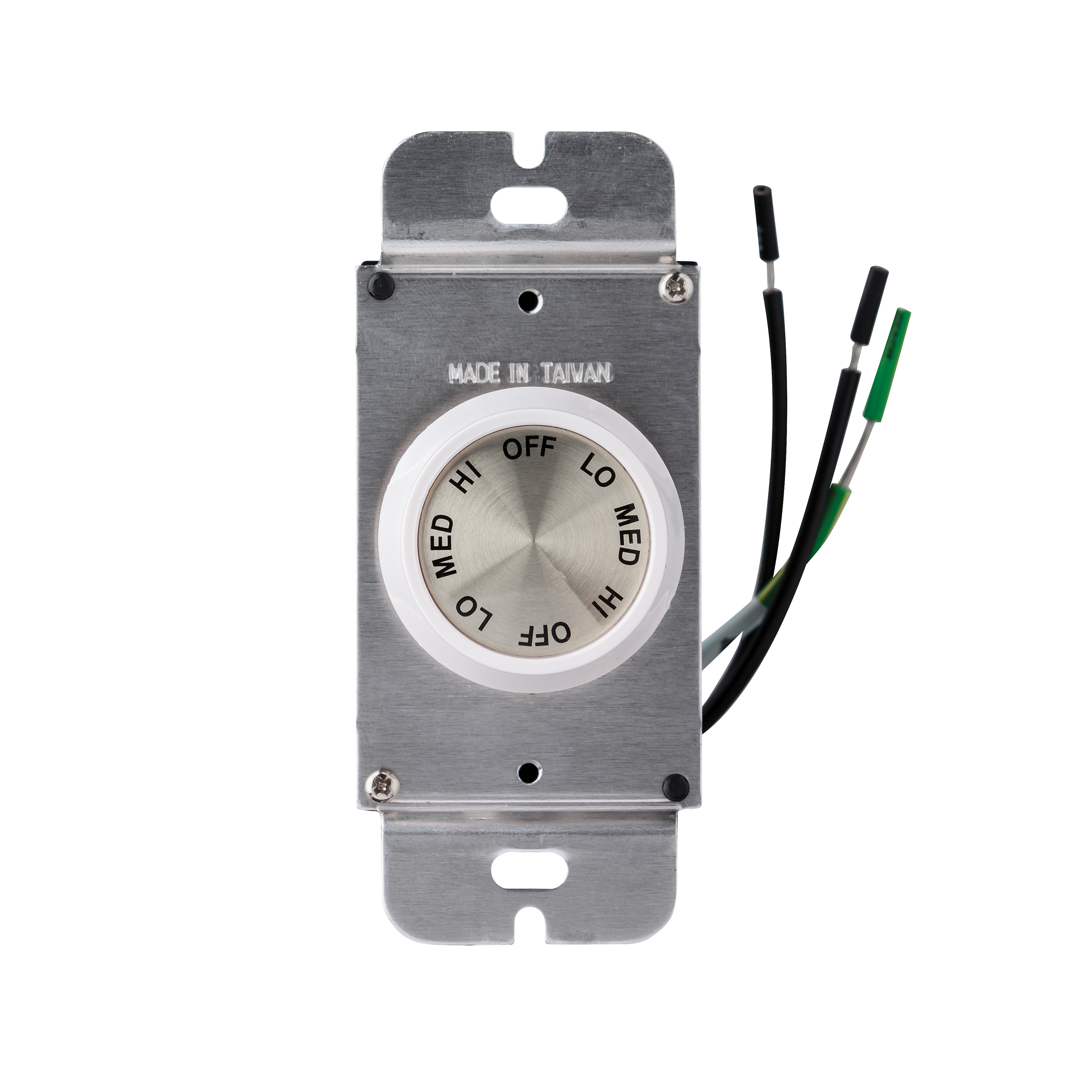 The Universal 3 Speed Rotary Wall Control in Ivory and White provides wall mounted hardwired control capability for compatible fans.