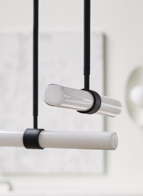 The Calumn 4-Light Chandelier by Sean Lavin for Visual Comfort Modern represents a modern version of the cascading chandelier. Calumn 4-Light Chandelier is designed with cylinder tubes to express dynamic volume and visual interest. Glass shades rotate left and right and the arcs may be rotated from side-to-side. Available in modern finishes. Complete the look with the entire Calumn Collection including Line-Voltage Pendant and 6-Light Chandelier.