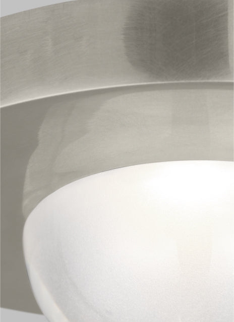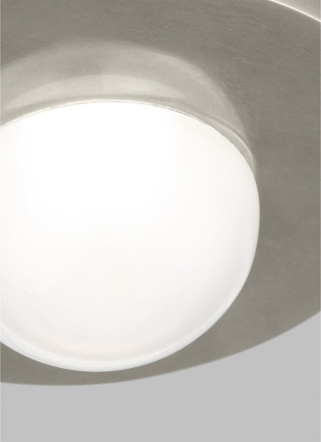The Ebell Mini Flush Mount by Kelly Wearstler for Visual Comfort Modern explores the evolution of the monopoint through an imaginative modern lens. Multi-dimensional domed glass prism is set into pure cylindrical metal body. The concentrated warm LED within the frosted glass interior emits a state-of-the-art expression of light in this illuminating departure from the expected.