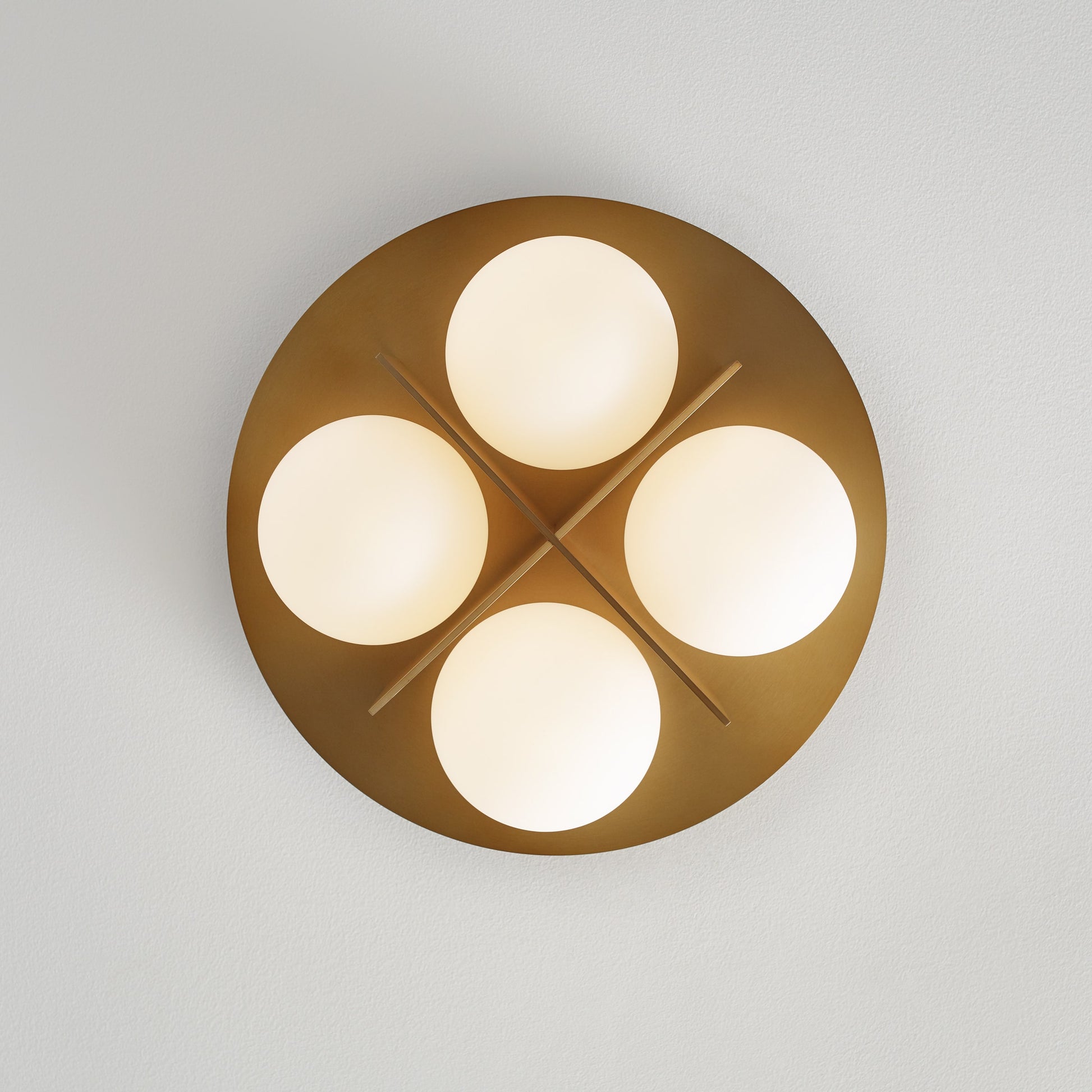 The Orbel Collection by Sean Lavin for Visual Comfort Modern is inspired by Mid-Century modern art with contrasting geometric shapes. The Orbel Flush Mount features a circular canopy that supports alternating metal squares and four frosted spheres of light. Designed with a 15” diameter, the Orbel Flush Mount is available in modern finishes. Coordinate your design with other fixtures in the Orbel Collection, such as the Wall Sconce, Bath Light and Pendants. Lamping options are compatible with most dimmers. Refer to the Dimming Chart for more information.