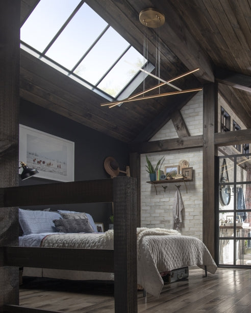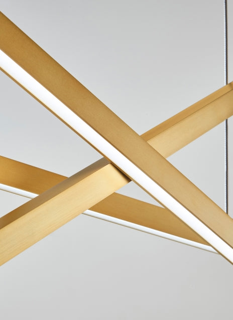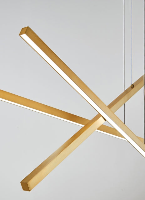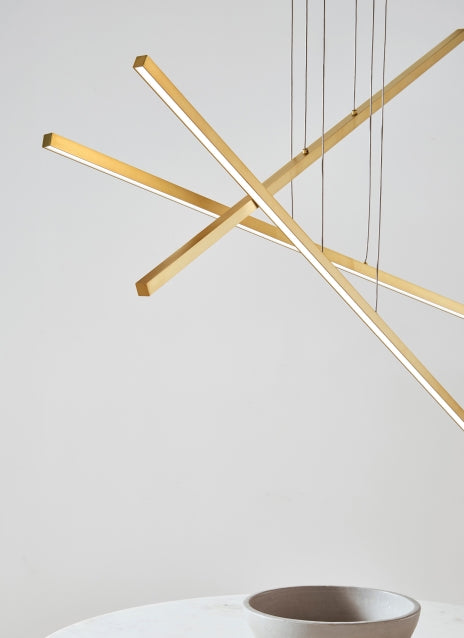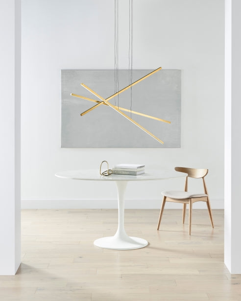 The ultimate in modern minimalism, the Essence Trio by Visual Comfort Modern Collection has three streamlined, linear lengths which are staggered randomly to create this dramatic and oversized modern interpretation of a chandelier. Ideal for lighting a dining room table, kitchen island or a conference room table, Essence is available in modern finishes. Its dimensions are 17.8" high and 50" long. Each of the three linear lights are only .75" thick and 7.5" wide. Damp-rated and dimmable.