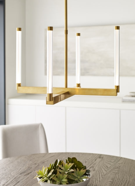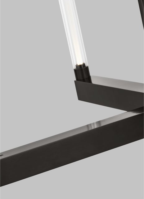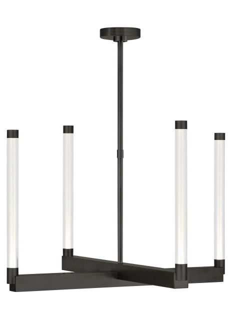 The Phobos Medium Chandelier by Kelly Wearstler for Visual Comfort Modern exceptionally contemplates clean intersecting forms and the purity of tubular light in a modern dialogue of geometries. Radial and rectilinear landscapes create a sculptural world for customized LED lamping that features a central light-guide for a fully diffused glow.