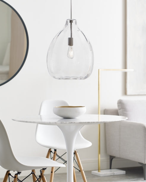 The Harper pendant by Visual Comfort Modern Collection draws the eye with its beautiful tear dropped ribbed organic texture. This large glass pendant is handcrafted by highly skilled artisans on Murano Island Venice. The artisans start by creating a classic bulb shape and then gently manipulate the glass into a perfectly ribbed texture. This contemporary glass pendant comes in multiple on-trend finishes. Available lamping options include energy efficient LED or no-lamp, leaving you the option to light this fixture with your preferred lamping. The LED lamping option is fully dimmable to create the desired ambiance in your special space. With its grand scale and beautiful color options the Harper pendant is ideal for dining room lighting, home office lighting and foyer lighting.