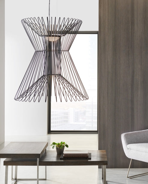The modern Syrma Pendant by Sean Lavin for Visual Comfort Modern features dozens of machined metal rods which are painstakingly fastened at perfectly spaced intervals to form an incredible multidimensional shade. At its core, this pendant, available in a scalable 19" and an oversized 38" heights, emanates light from its smoothly diffused LED source to illuminate surfaces below such as kitchen island lighting, dining room lighting, home office lighting, entry lighting or even commercial conference room lighting. Inspired by mid-century modern design, the Syrma is offered in multiple modern finishes.