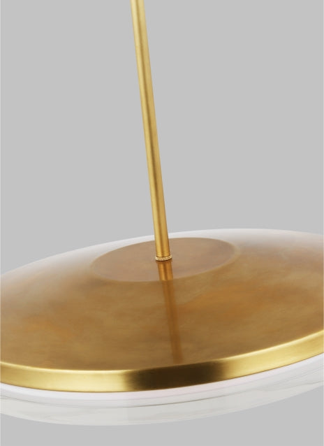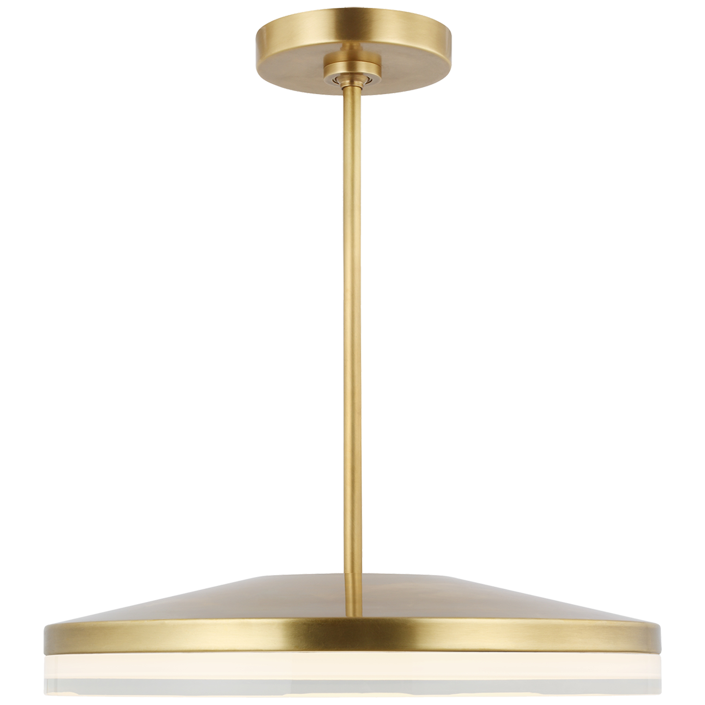 The Wyatt Large Pendant by Sean Lavin for Visual Comfort Modern is suspended in simplistic form, shaping the focus of your space with intriguing silhouette and warm illumination. The circular, clean edges of this large framed pressed glass diffuser float gently above, working together with the Integrated LED light. This item is made of natural brass. It will react to its environment and patina even with a protective coating. The continued warming in color is what we describe as a ‘living’ finish. It adds richness and depth to the fixture. If it gets an uneven patina, dark spots, or damage, restoring the finish can be accomplished with a natural brass cleaner. Please contact Technical Support for assistance.