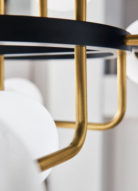 The Viaggio Chandelier by Sean Lavin for Visual Comfort Modern features an artistic cluster of glass orbs for a sense of celestial travel within a room. A sleek black body contrast against either solid brass arms with white glass globes or polished nickel arms with mirrored smoke globes for a rich and stunning finish, either choice creates a comfortable glare-free wash of illumination onto surfaces below. This stunning fixture is also available in a Linear Suspension, wall mount and ceiling mount making the Viaggio collection highly versatile in many spaces. Available lamping options include fully-dimmable energy efficient LEDs or no-lamp, leaving you the option to light the Viaggio with your preferred lamping.