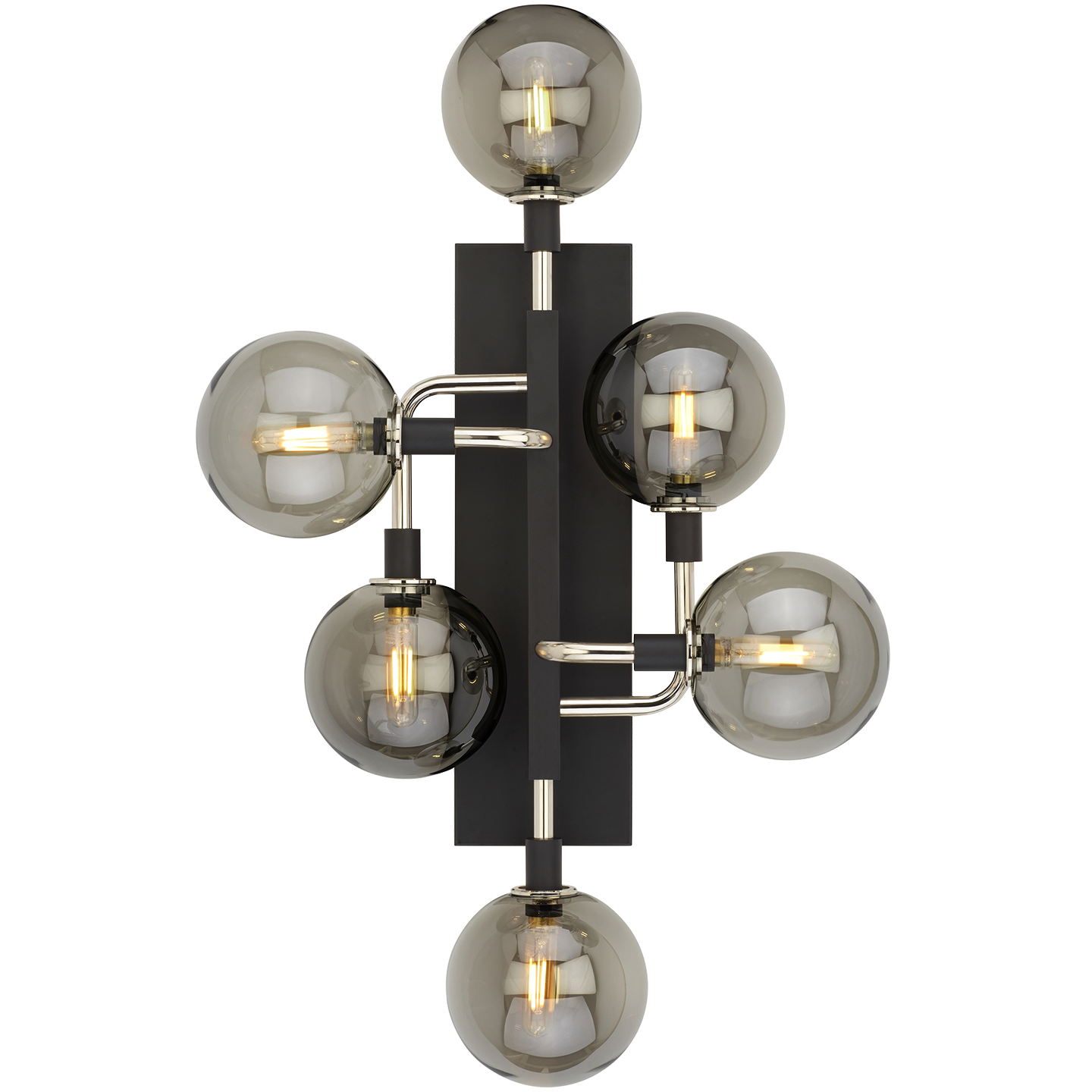 The Viaggio 5-Light Sconce by Sean Lavin for Visual Comfort Modern features an artistic cluster of glass orbs that seemingly hover along the wall to create a sense of celestial movement. A sleek black body contrasts against either sold brass arms with white glass globes or polished nickel arms with mirrored smoke glass globes for a rich and stunning finish, either finish delivers a soft wash of glare-free illumination onto surrounding surfaces. The Viaggio sconce scales at 24" in height and 12" in width making it ideal for hallway lighting, foyer lighting and bedroom lighting. The Viaggio can carry into other areas of your space as this collection is available as a suspension, linear, and flush mount. Available lamping options include fully-dimmable energy efficient LEDs or no-lamp, leaving you the option to light the Viaggio with your preferred lamping.