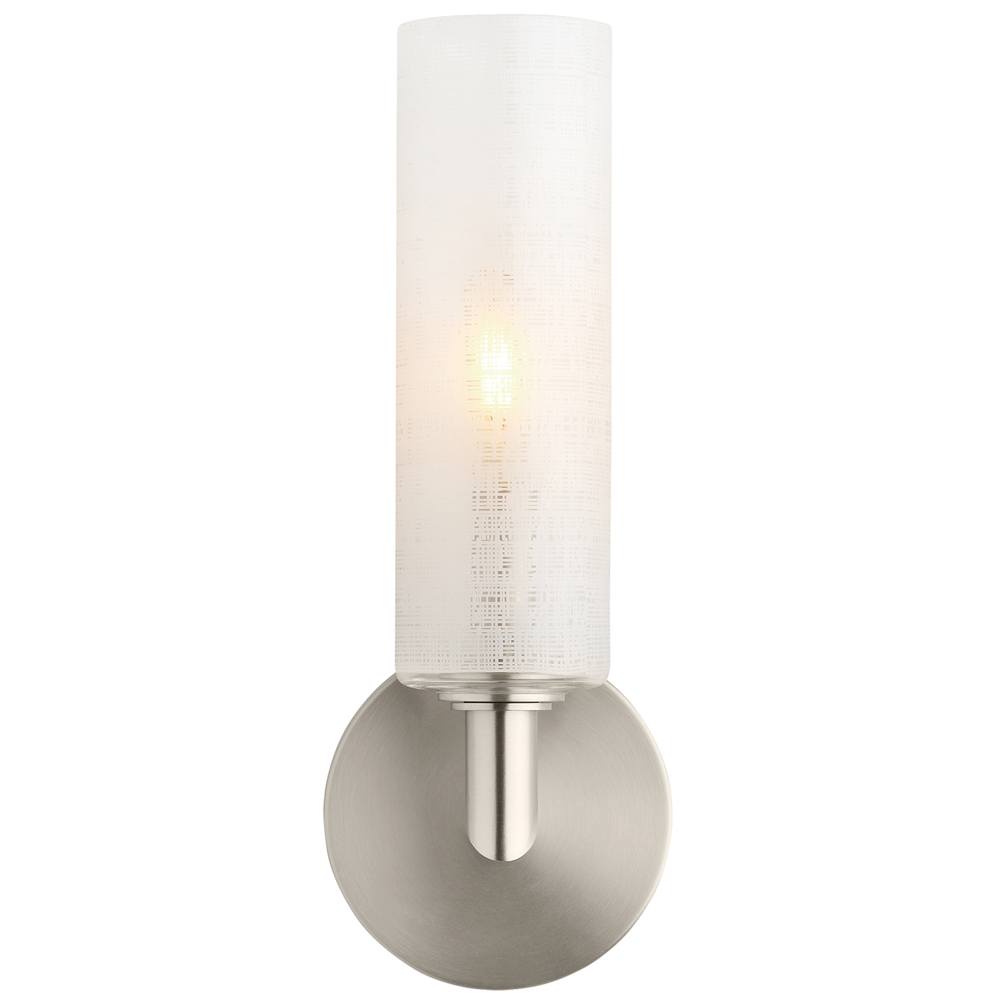 Inspired by textiles, the Vetra wall sconce light by Visual Comfort Modern Collection has a linen weave design which is silk screened on to the hand-blown glass shade, creating a textured surface through which the light softly glows. The artisan glass treatment is a subtle design element that gives this clean, contemporary profile a warm, tailored look, making it a beautiful accent in modern to transitional décor in both residential and professional settings. Perfect for hallway lighting, dining room lighting, bedroom lighting and bathroom lighting, the fixture has Clear Linen glass. Three other light fixtures are available with the same Vetra styling. a small pendant light, a large pendant light, and a ceiling light. Damp-rated and dimmable, it’s 13.2" high and 4.9" in diameter with an extension of 3.9", making it ADA compliant.