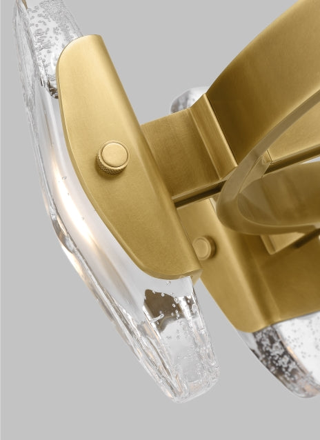 The Wythe Medium Chandelier by AvroKO for Visual Comfort Modern presents a strong impression with smooth diffusing light in its most honest and simplest form. It is created from the marriage of industrial elements and the raw natural expression of glass. The cylindrical brass structure holds cast glass that is lit to highlight the natural fissures and imperfections from the casting process. This fixture proves its distinction over time, aging with elegance and becoming unified with the place it intends to call home.
