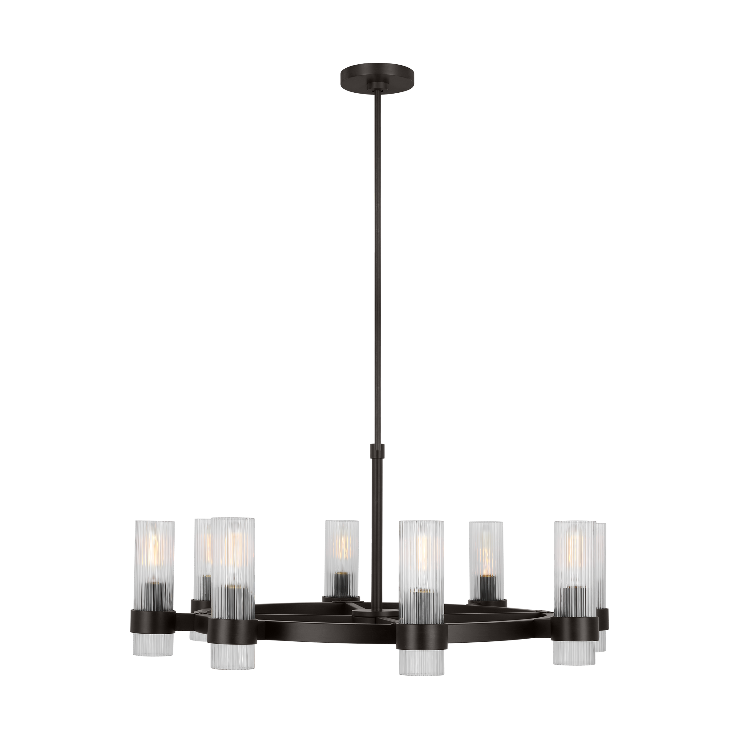 Designed by Chapman & Myers, the Geneva eight-light single-tier chandelier in Aged Iron supplies ample lighting for your daily needs while adding a layer of today's style to your home's décor. A fluted shade forms an elegant, dynamic silhouette balanced by a strong frame of Aged Iron, Burnished Brass, or Polished Nickel.