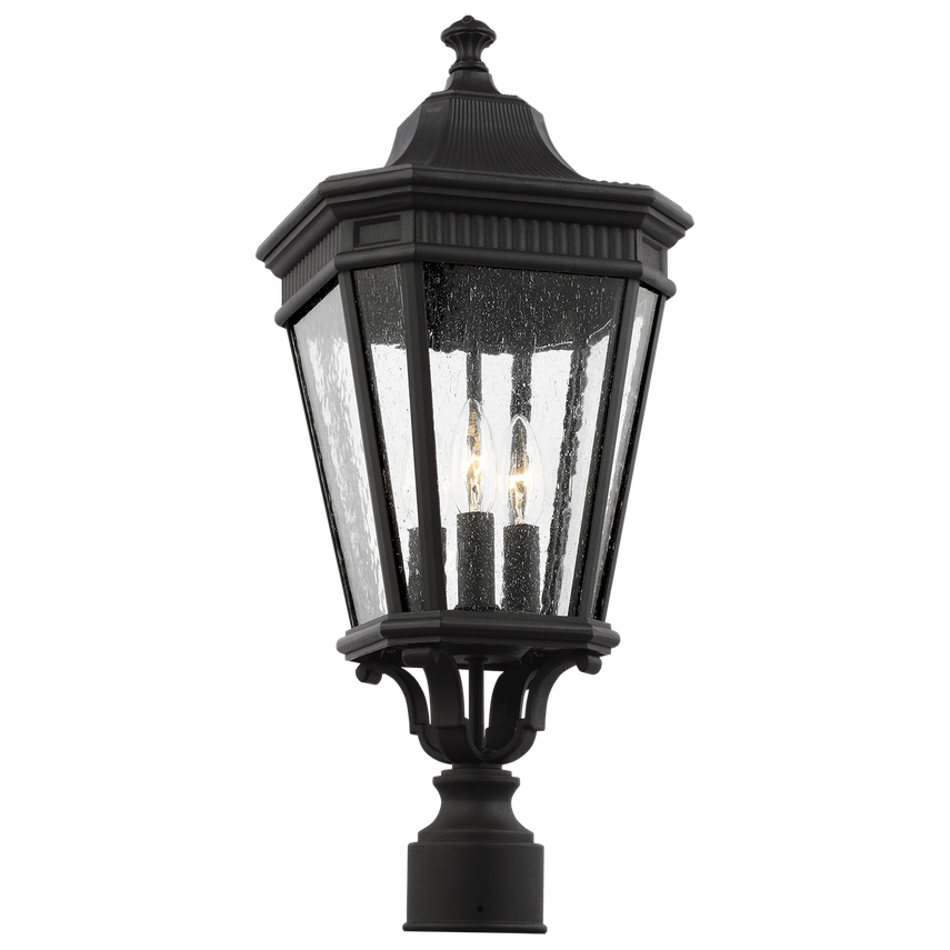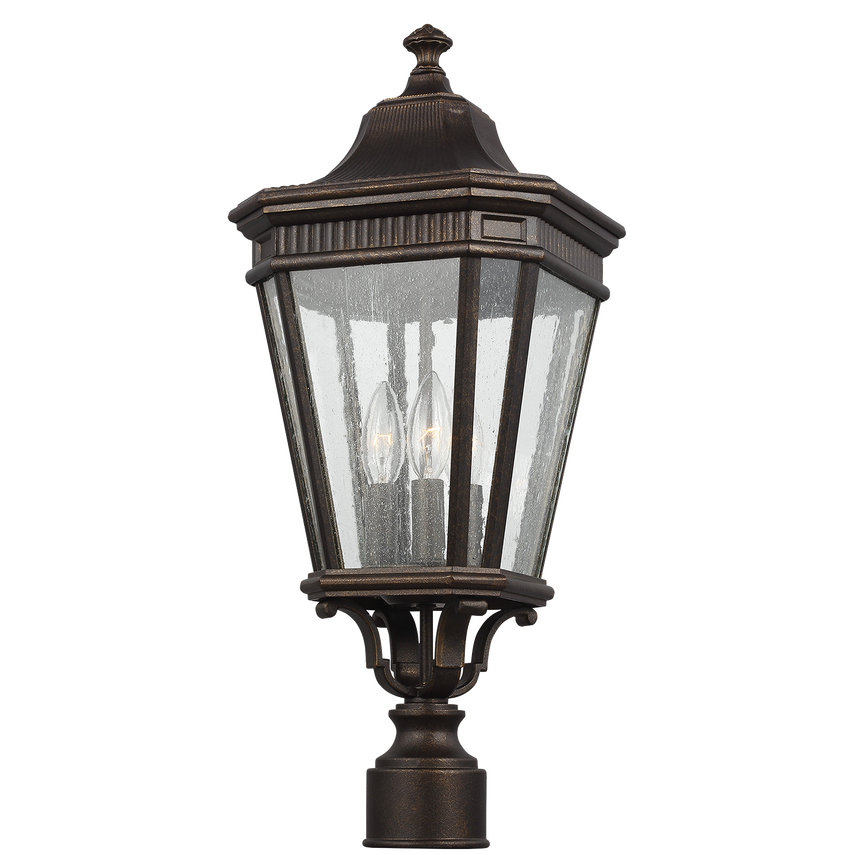 The traditional, antique gas lantern-inspired design of Cotswold Lane features dentil molding at the top of each pane of beveled glass. Cotswold Lane's profile is timeless and elegant. Available with two finish and glass options: a Black or Grecian Bronze frame with Clear Beveled glass or Clear Seeded glass panels.