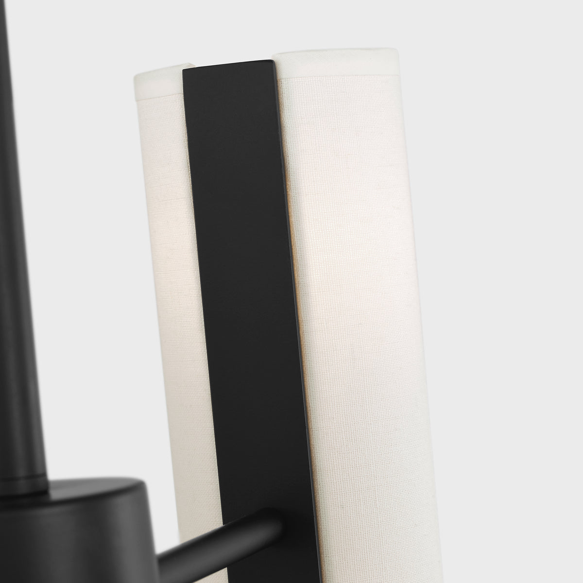 Sleek and modern, this contemporary collection features cylindrical linen shades and a visible flat spine for a clean look. It features a candelabra-style fixture with four sleek arms referencing mid-century modern design. On the end of each arm, frosted glass shades direct soft light in both directions.