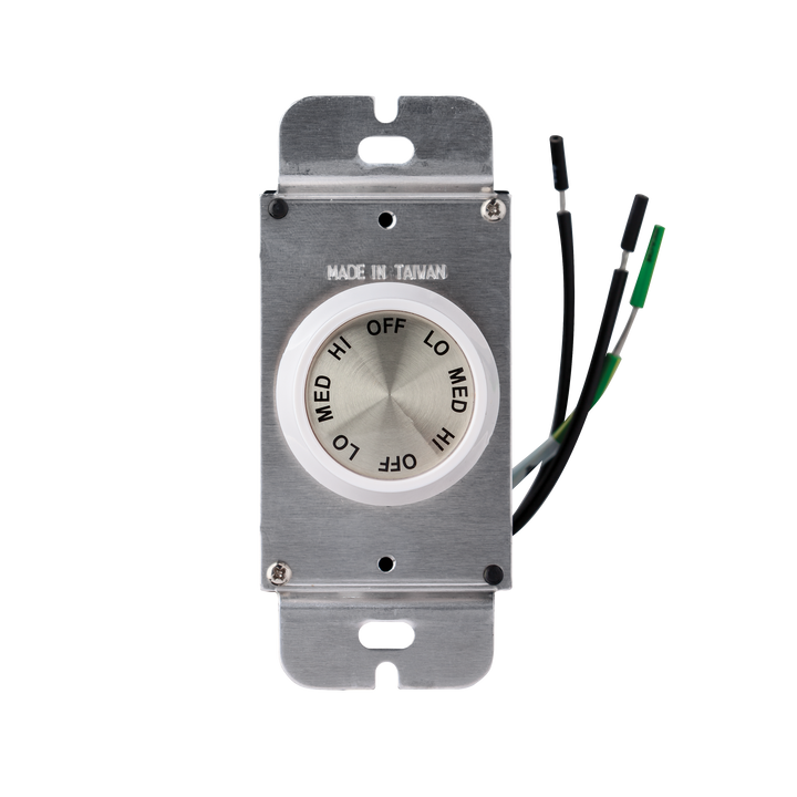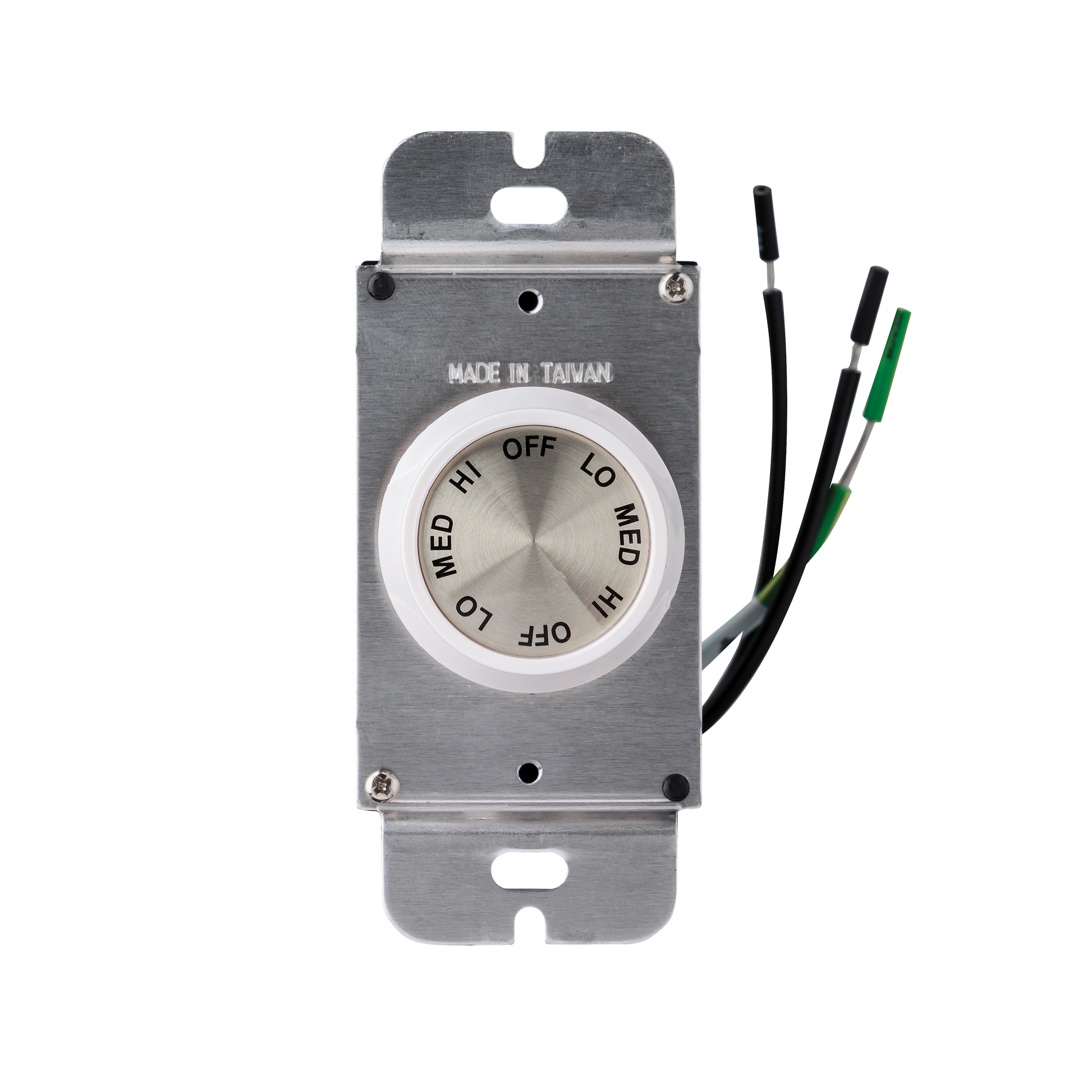 The Universal 3 Speed Rotary Wall Control in Ivory and White provides wall mounted hardwired control capability for compatible fans.