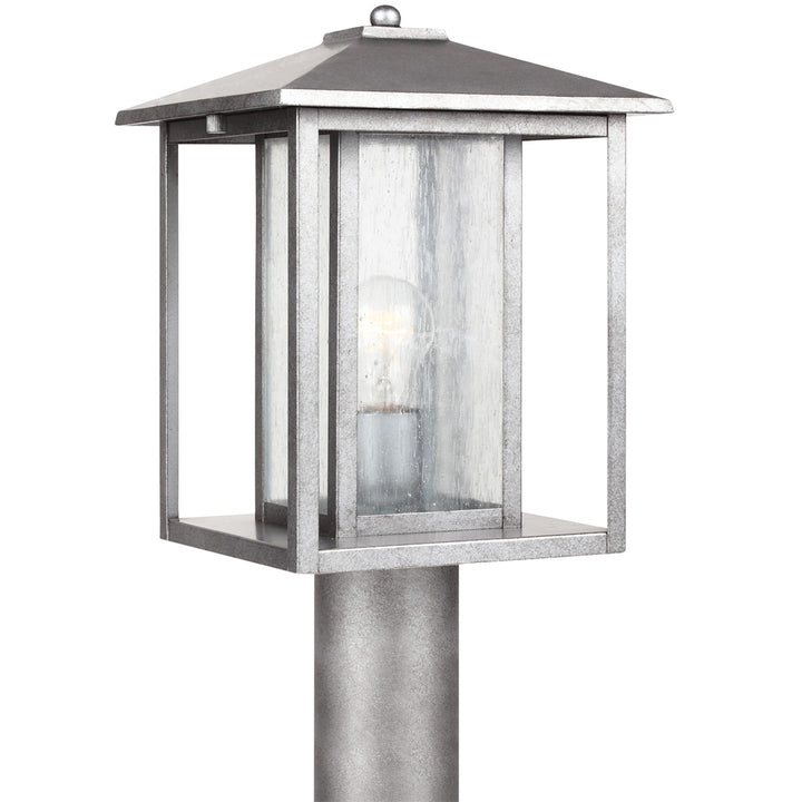 The Hunnington one light outdoor post top in black enhances the beauty of your property, makes your home safer and more secure, and increases the number of pleasurable hours you spend outdoors. A bit of Shaker minimalism mixed with Arts and Crafts styling defines the transitional Hunnington outdoor lighting collection by . Equally at home in the city or the country, this timeless style will enhance the appearance of a home's entrance with its clean, crisp lines. Offered in Weathered Pewter or Black finishes, with either Etched Seeded glass or Clear Seeded glass, the assortment includes a one-light outdoor pendant, small and large one-light outdoor wall lanterns, a one-light out door post lantern and a two-light outdoor ceiling flush mount. Both incandescent lamping and ENERGY STAR-qualified LED lamping (for those fixtures with the Etched Seeded glass) are available for most of the fixtures, and some can easily convert to LED by purchasing LED replacement lamps sold separately (for those with the Clear Seeded glass).
