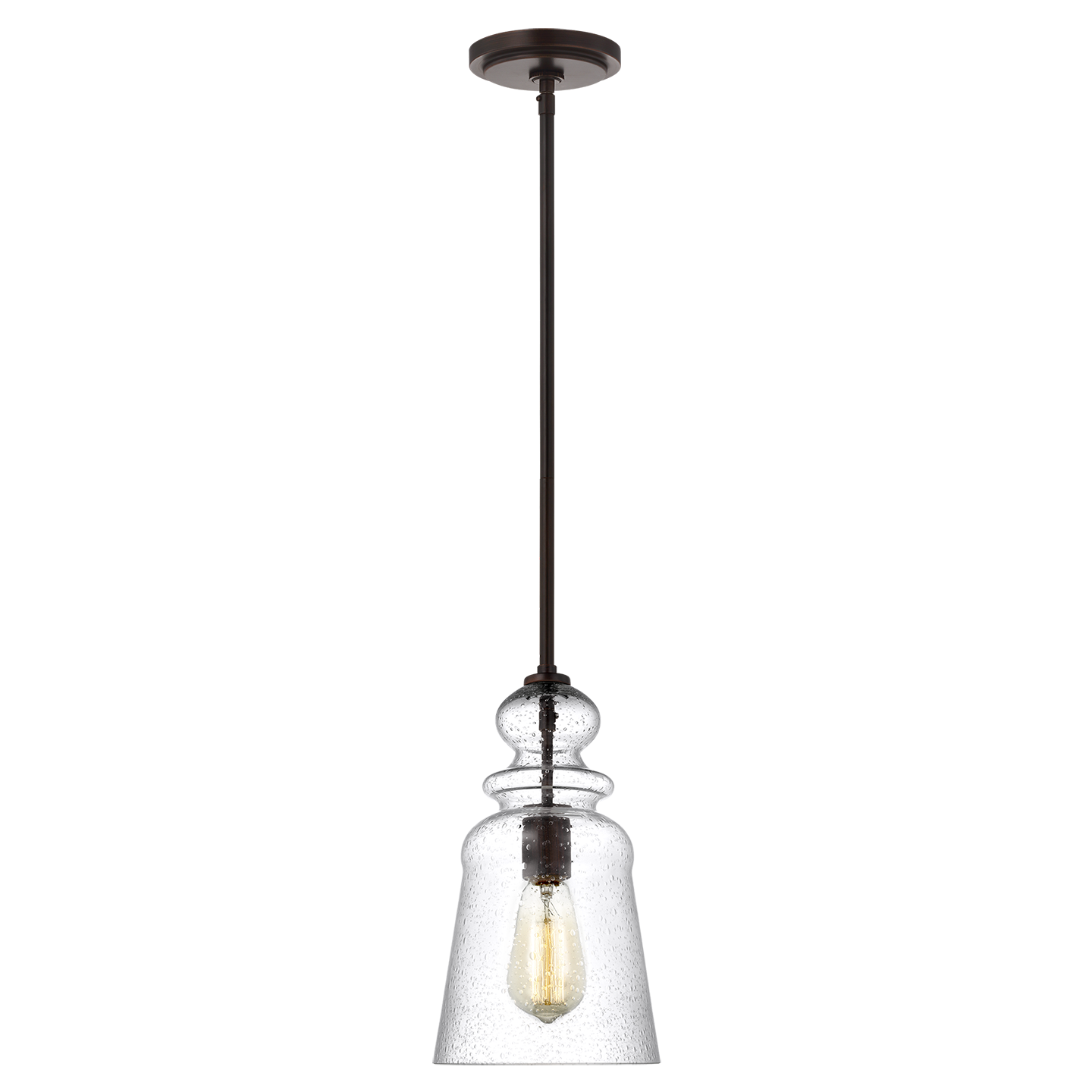 The Kea one light indoor pendant in bronze is the perfect way to achieve your desired fashion or functional needs in your home. Inspired by the stacked modern elements of items found in Parisian boutiques, the silhouette of the Kea Collection by offer a signature focal point with a single lamp suspends downward from the center. A hint of Brushed Nickel or Heirloom Bronze peeks through the Clear Seeded glass becoming a central design element of the fixture. Kea pendants may be installed as single pendants or clustered in multiples, which would be an ideal installation used for entry lighting, dining room lighting, living room lighting or kitchen lighting over a table. Fixtures are California Title 24 compliant and easily convert to LED by purchasing LED lamps sold separately.