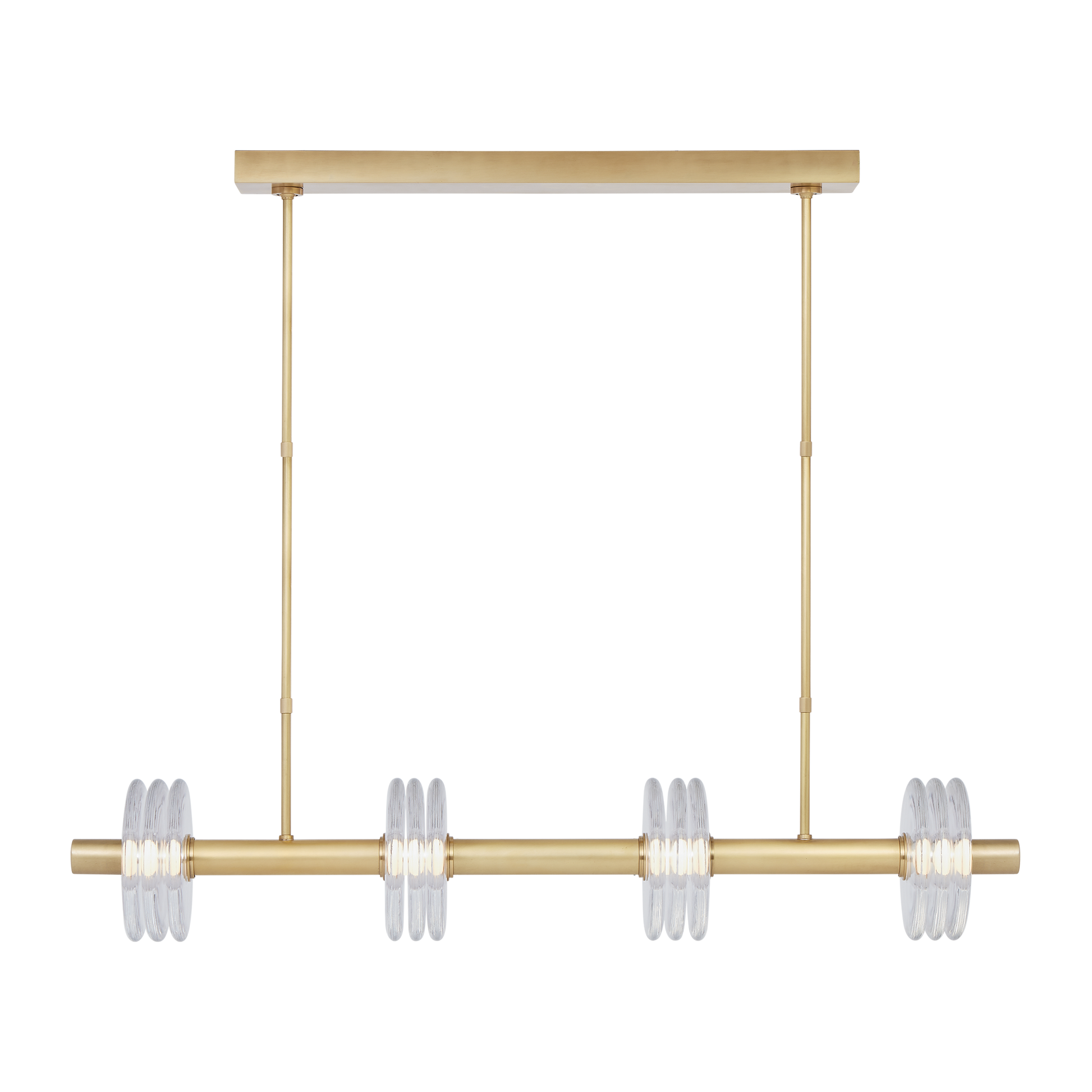 The Laurel Large Linear Chandelier Pendant by Kelly Wearstler epitomizes elegance and craftsmanship. The Italian glass disk of light surround the LED at the center body, creating lots of movement and a stunning illuminating effect. Each pendant is meticulously handcrafted by skilled artisans in the heart of Italy, ensuring that every piece is a true work of art.