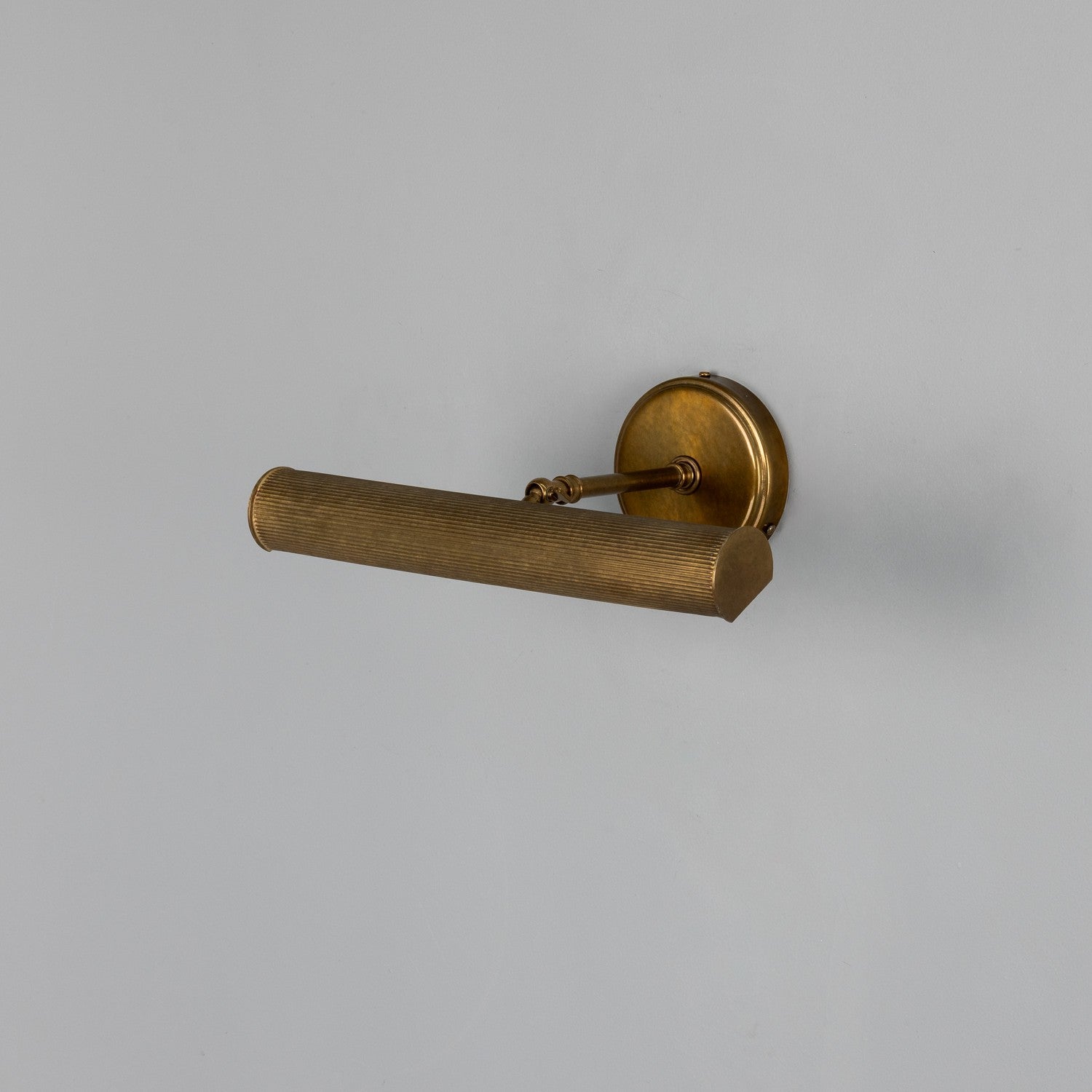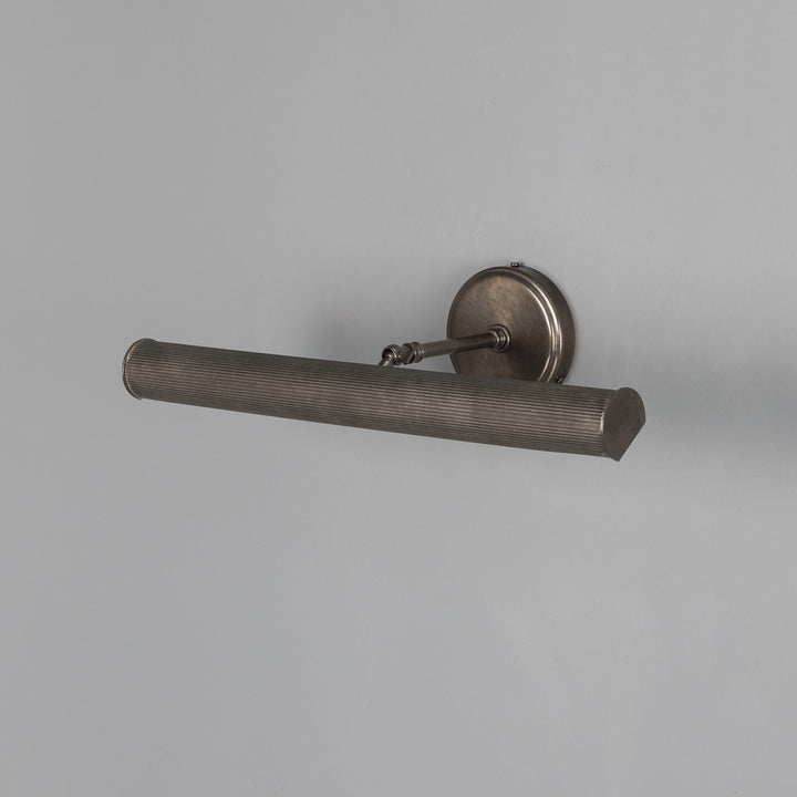 Designed to enhance both classic and contemporary interiors, the Bilbury picture light is expertly crafted from solid brass and distinguished by finely reeded detailing along its cylindrical shade. Measuring 14" wide, this wall-mounted fixture features an adjustable joint that allows you to direct light precisely where it's needed—perfect for highlighting artwork, photographs, or cabinetry. The reeded brass surface introduces subtle texture, catching and reflecting light in elegant linear patterns, while the compact round backplate keeps the overall look clean and refined. Available in a selection of hand-applied finishes, including antique brass, polished brass, satin brass, and antique silver, the Bilbury balances functional flexibility with elevated design. Ideal for living rooms, hallways, and gallery settings, this dry-rated picture light delivers focused, atmospheric illumination exactly where it matters most.