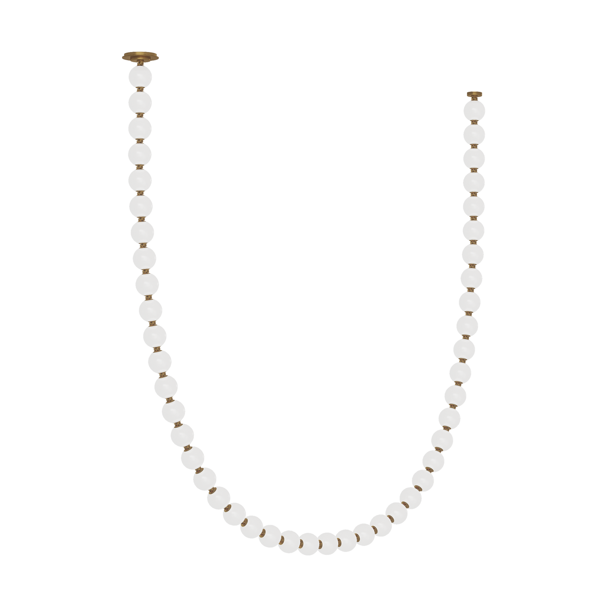 The Perle by Sean Lavin is a stunning extension to the popular Collier Series, now offered in soft white glass to provide a different design presence in a room. Available in multiple-length strands for the ultimate customization. Perle can be hung straight down in pendant form or draped from two mounting points for a striking chandelier utilizing the surface canopy or more minimal remote driver canopy. Interweave individual stands to create incredible light sculptures with stunning illumination. The natural brass connectors are custom engineered to support the glass and add additional beauty to the piece. Available with remote or surface-mounted driver options. Predetermined length options allow easy ordering with virtually unlimited versatility—contact the factory for custom configurations. Patent pending.