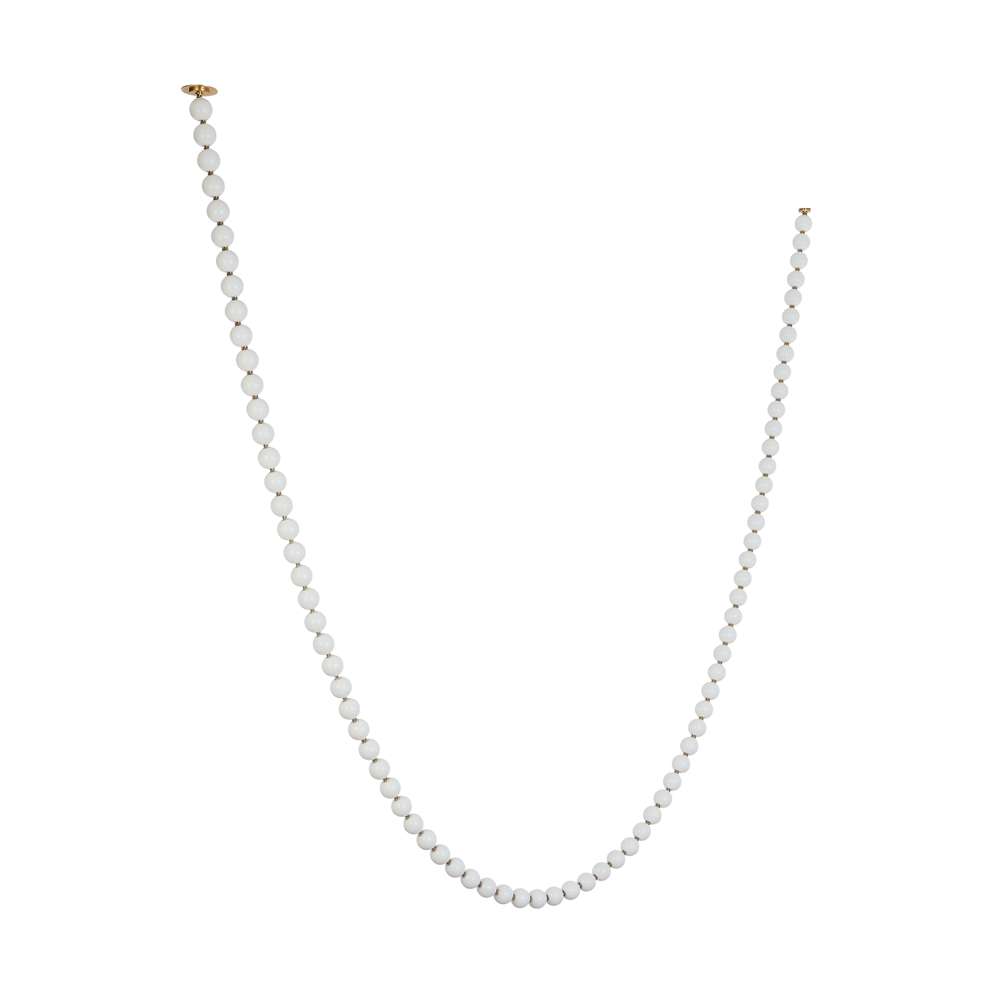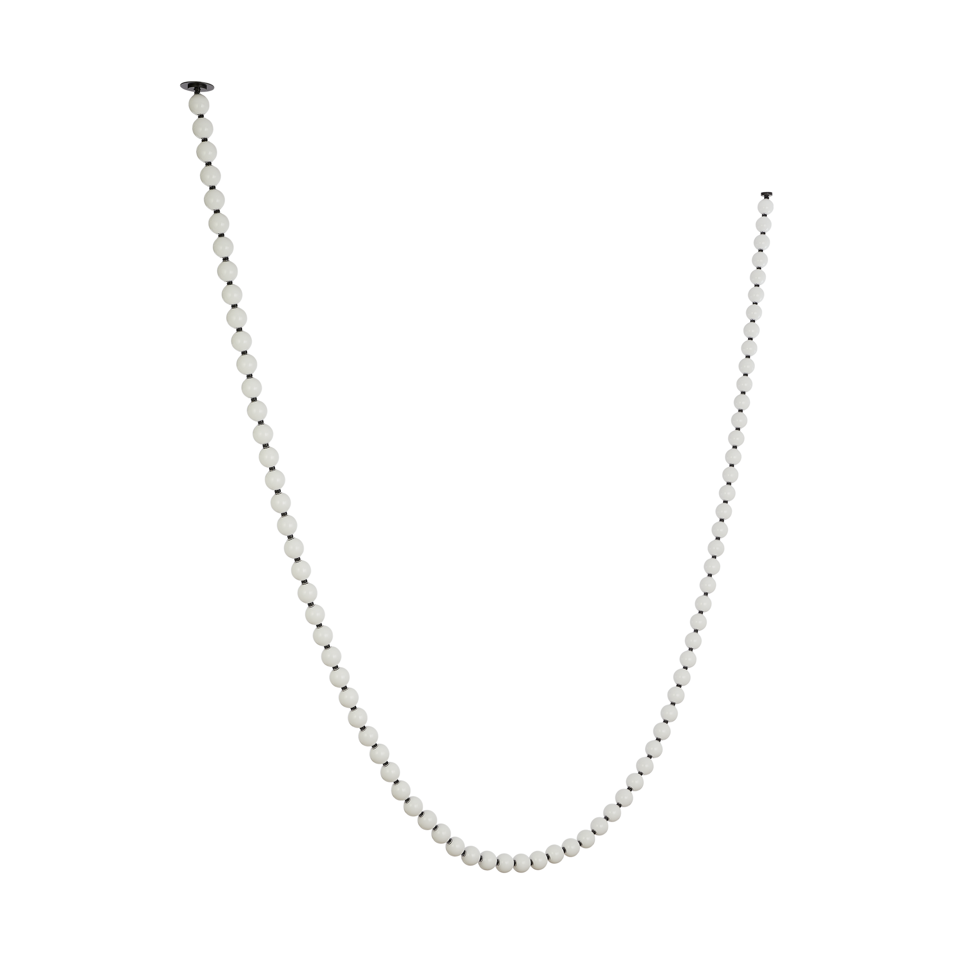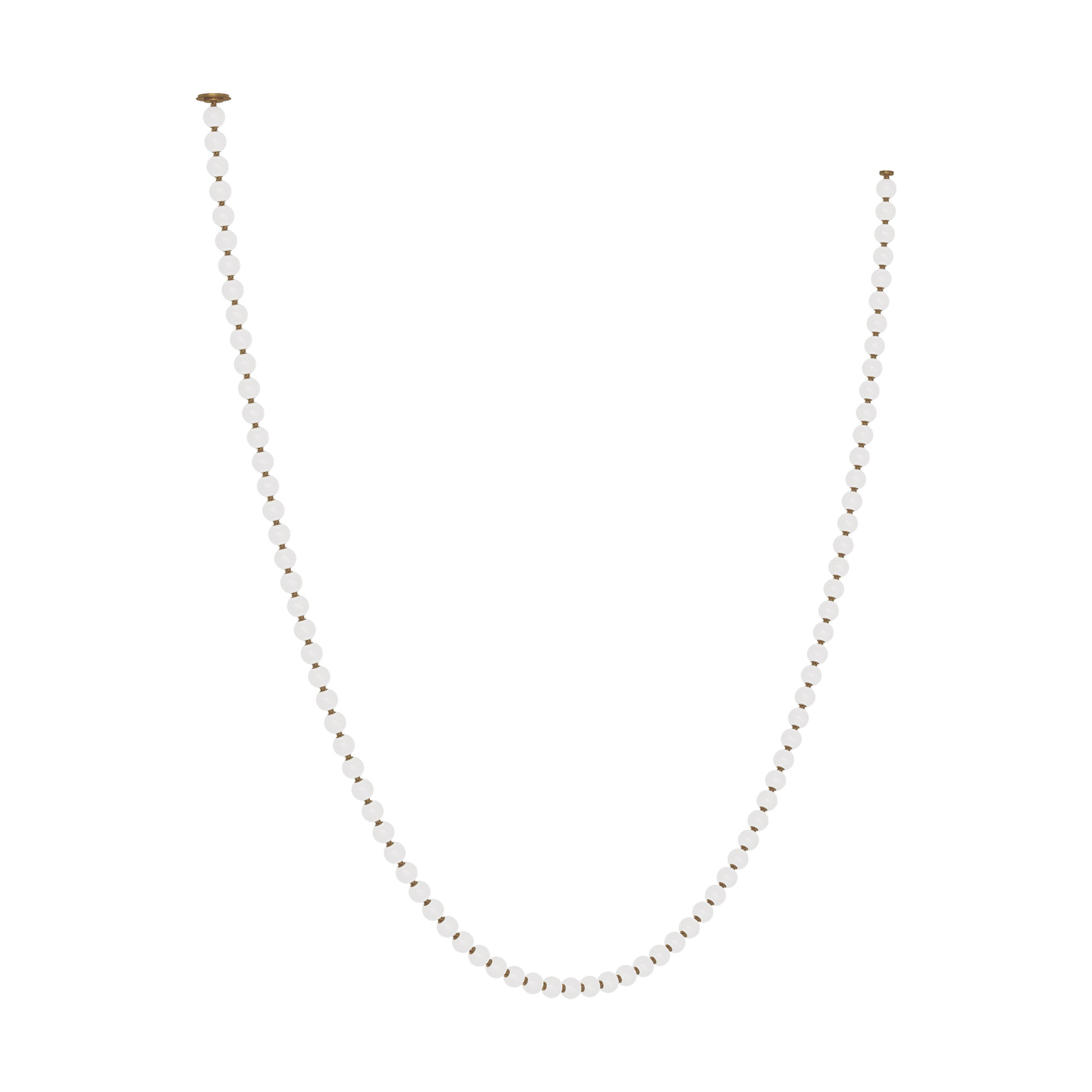 The Perle by Sean Lavin is a stunning extension to the popular Collier Series, now offered in soft white glass to provide a different design presence in a room. Available in multiple-length strands for the ultimate customization. Perle can be hung straight down in pendant form or draped from two mounting points for a striking chandelier utilizing the surface canopy or more minimal remote driver canopy. Interweave individual stands to create incredible light sculptures with stunning illumination. The natural brass connectors are custom engineered to support the glass and add additional beauty to the piece. Available with remote or surface-mounted driver options. Predetermined length options allow easy ordering with virtually unlimited versatility—contact the factory for custom configurations. Patent pending.