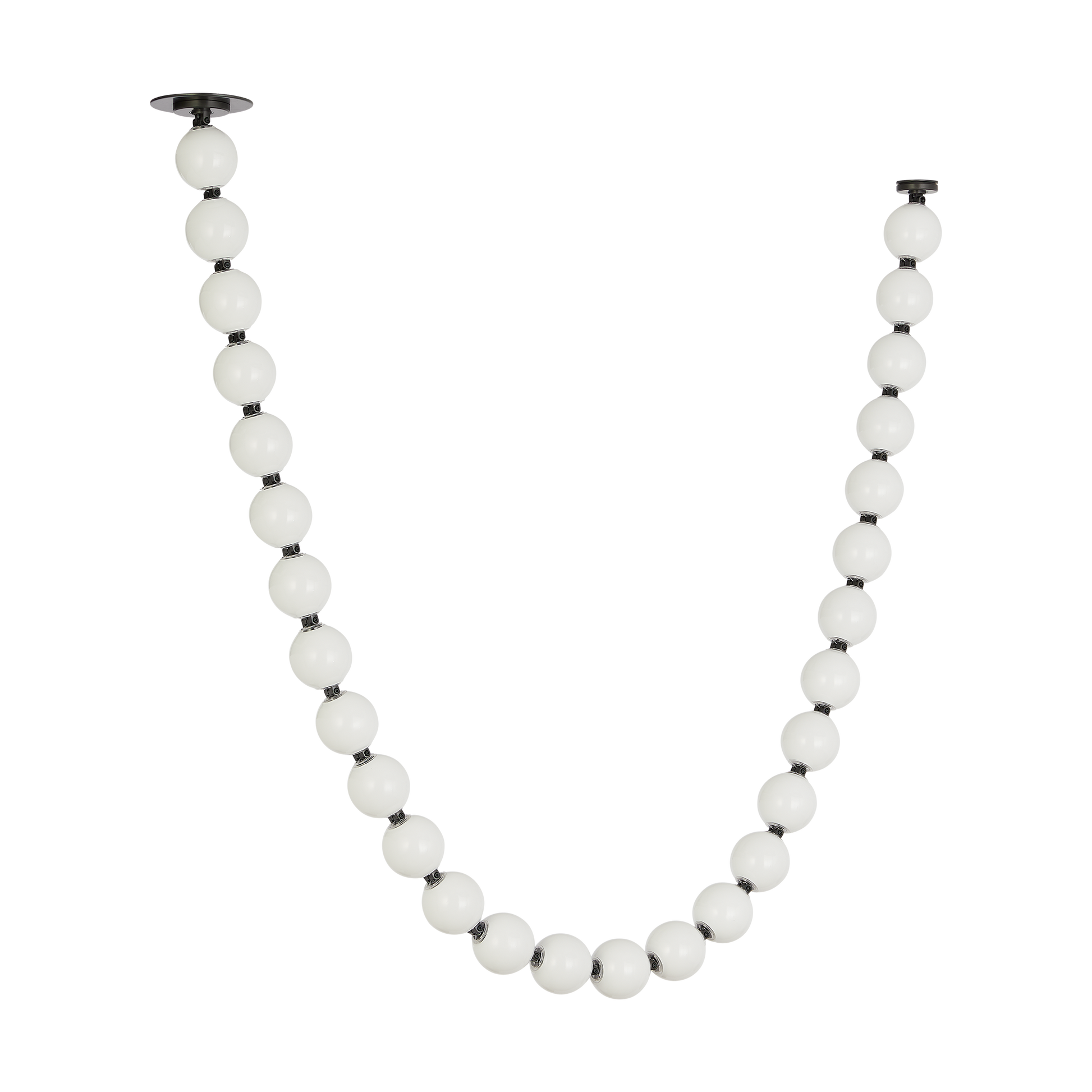 The Perle by Sean Lavin is a stunning extension to the popular Collier Series, now offered in soft white glass to provide a different design presence in a room. Available in multiple-length strands for the ultimate customization. Perle can be hung straight down in pendant form or draped from two mounting points for a striking chandelier utilizing the surface canopy or more minimal remote driver canopy. Interweave individual stands to create incredible light sculptures with stunning illumination. The natural brass connectors are custom engineered to support the glass and add additional beauty to the piece. Available with remote or surface-mounted driver options. Predetermined length options allow easy ordering with virtually unlimited versatility—contact the factory for custom configurations. Patent pending.