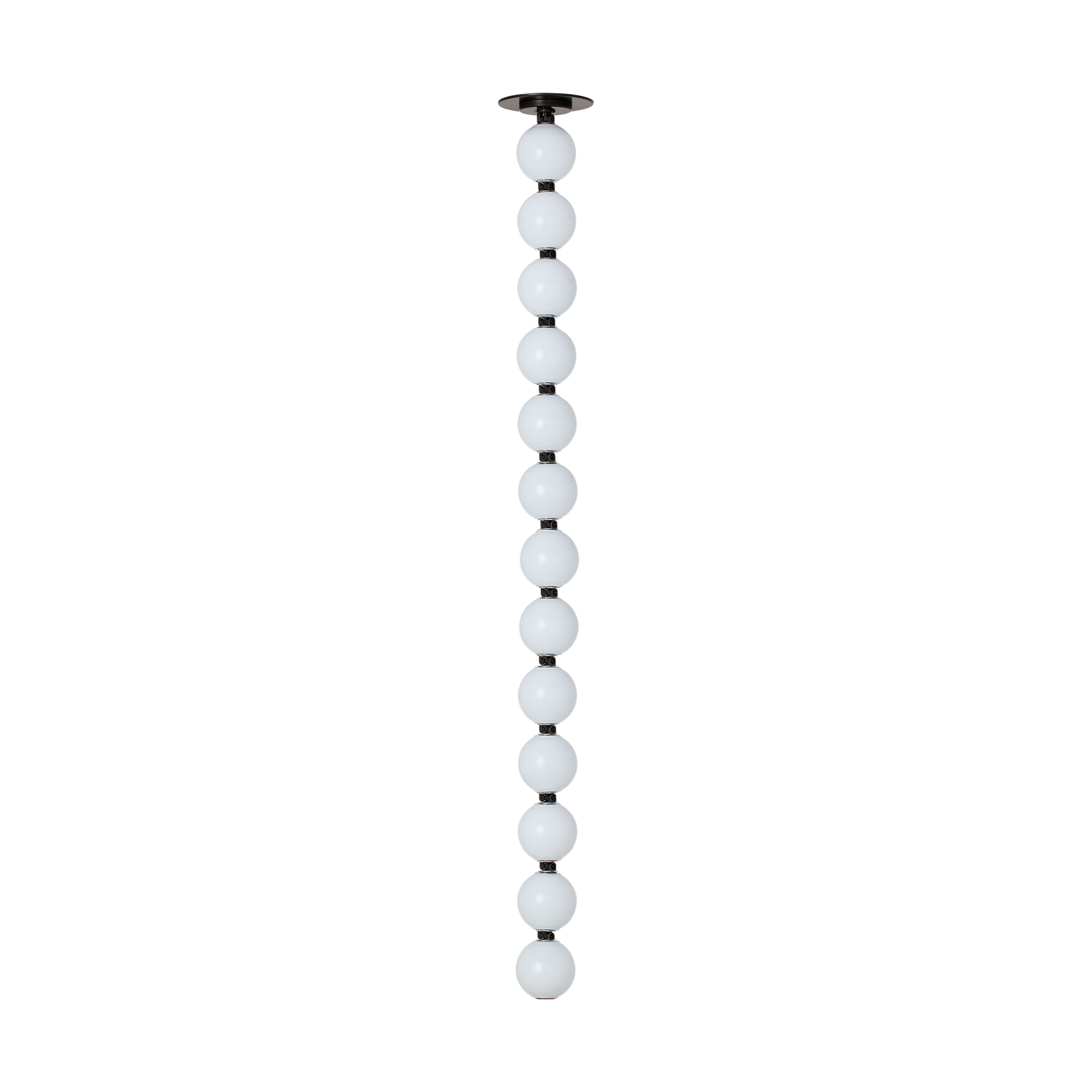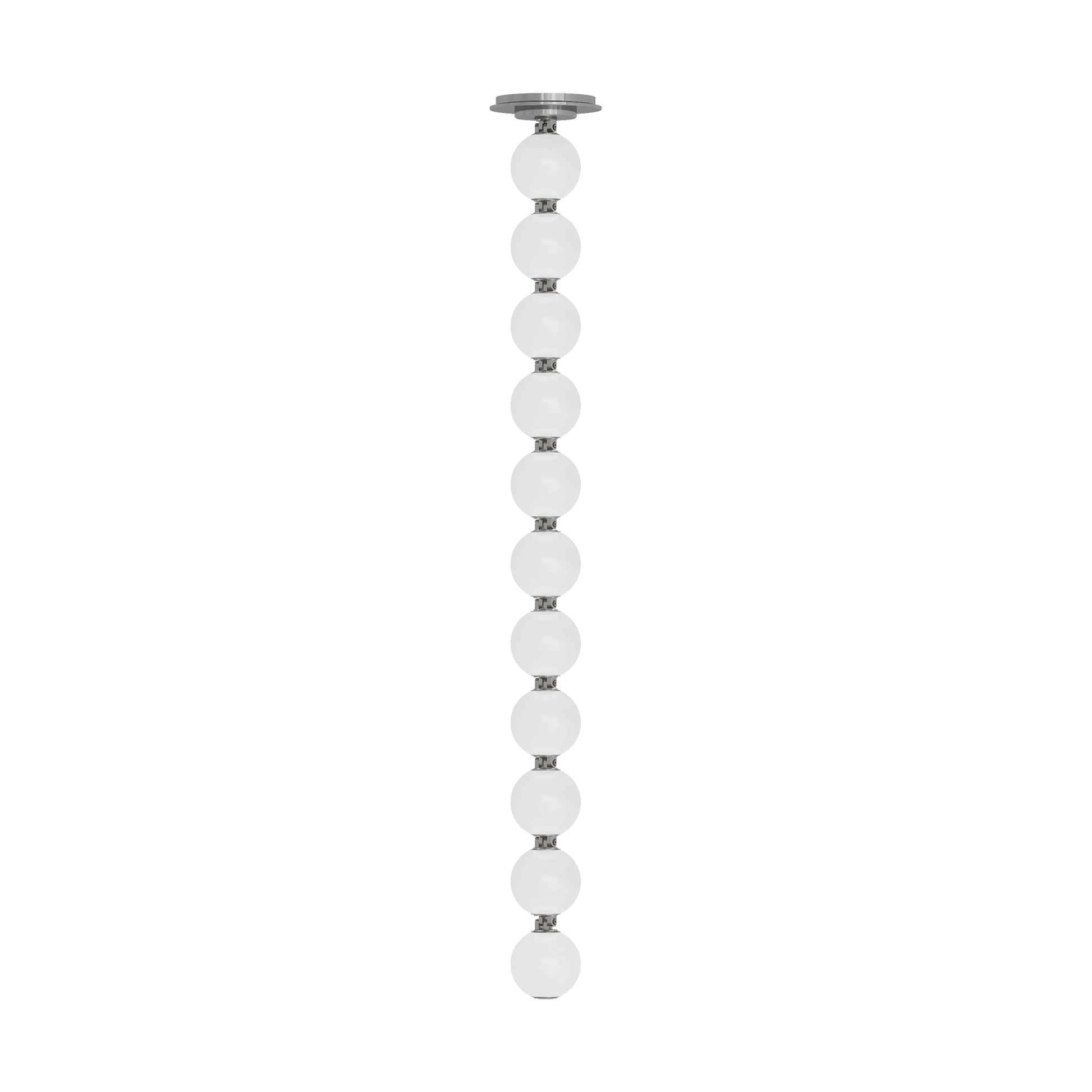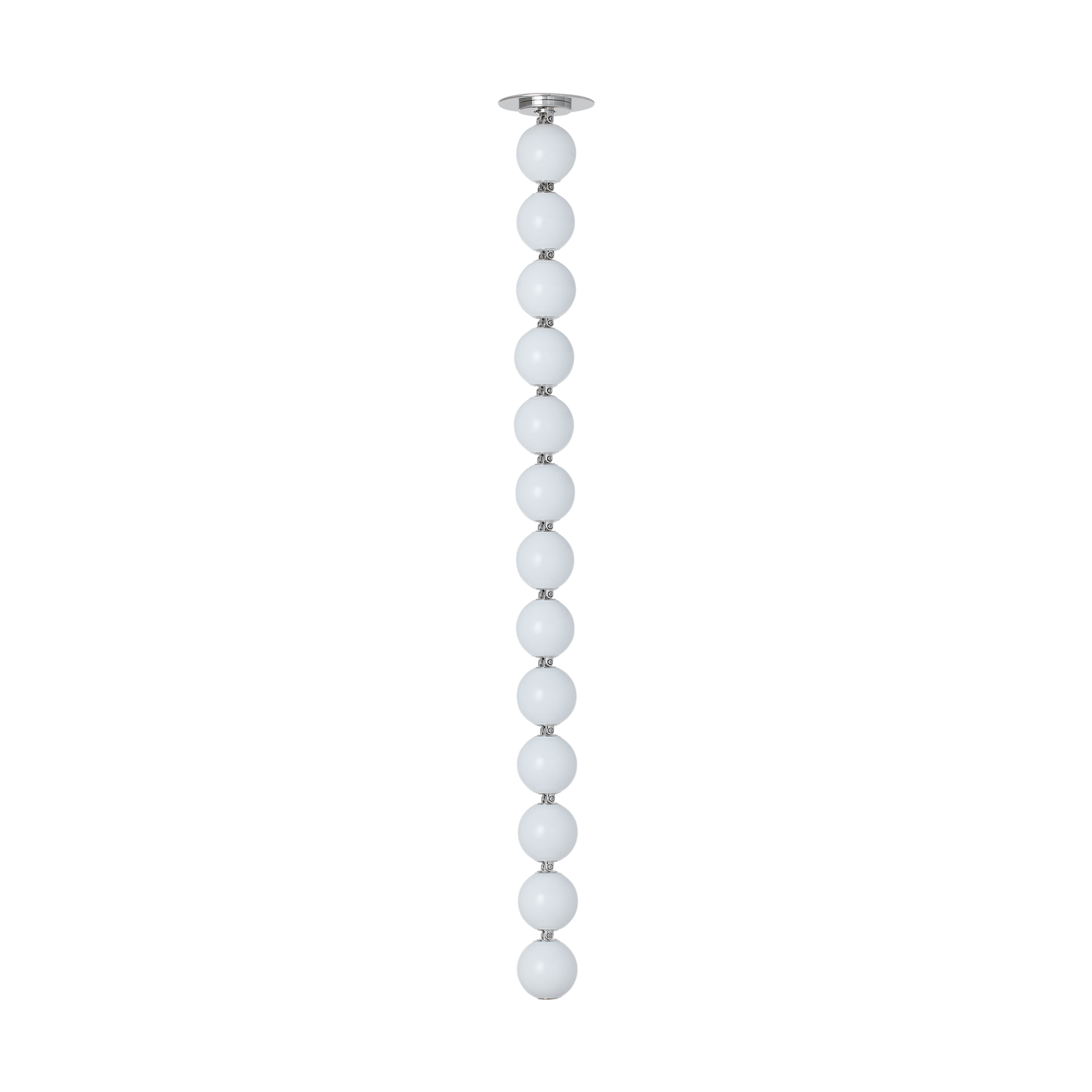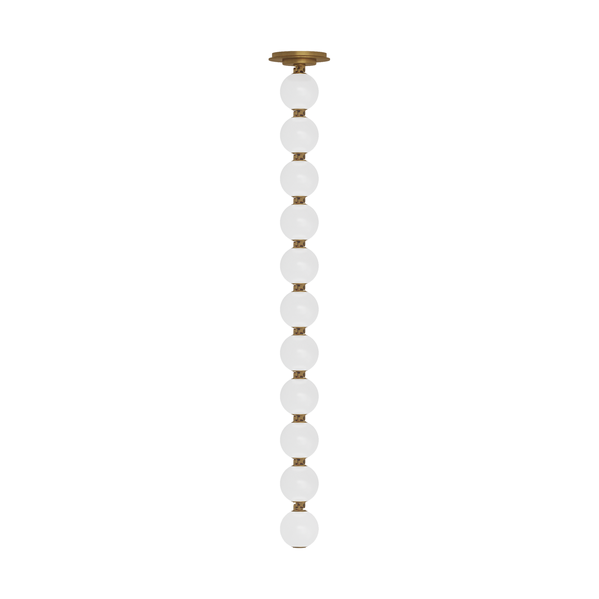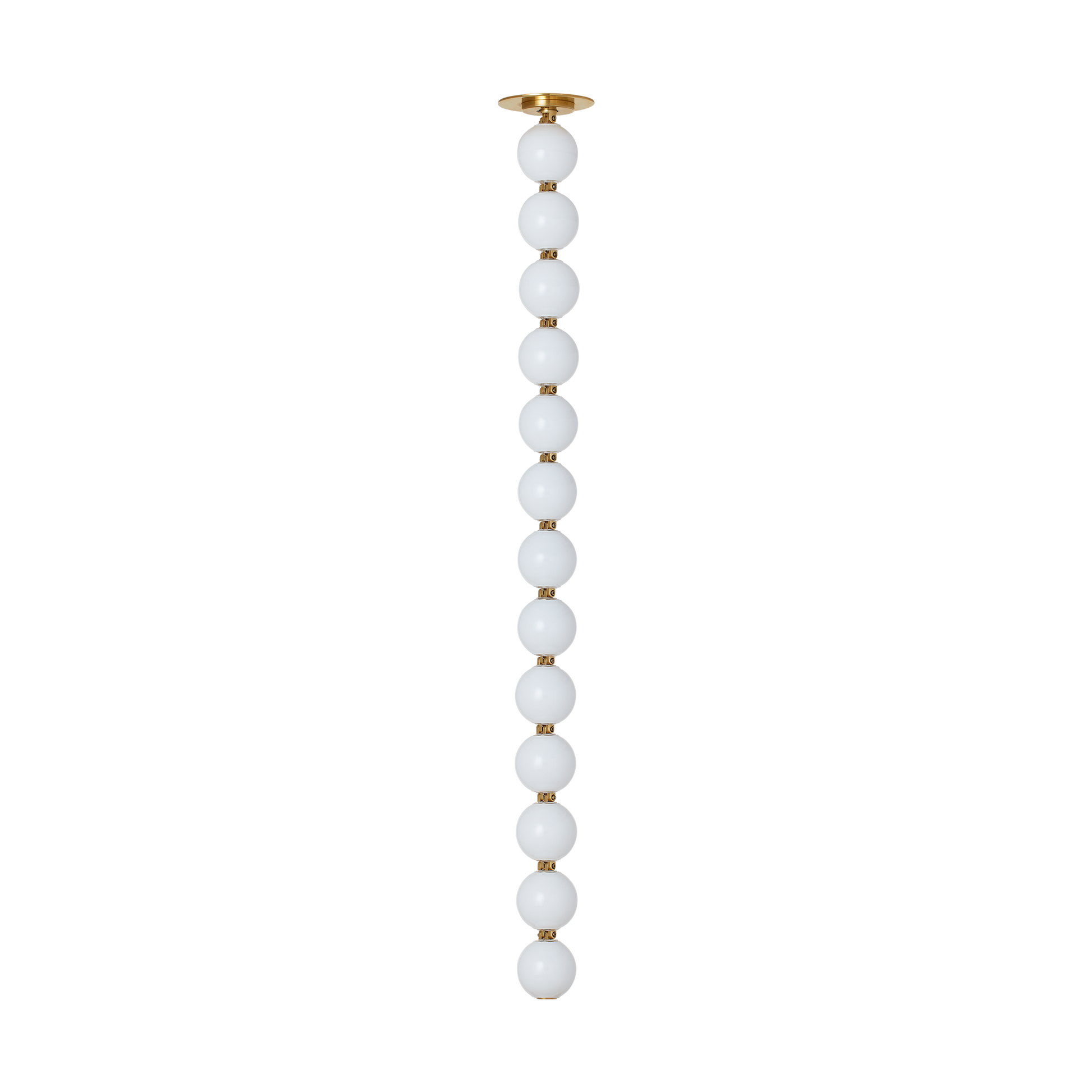 The Perle by Sean Lavin is a stunning extension to the popular Collier Series, now offered in soft white glass to provide a different design presence in a room. Available in multiple-length strands for the ultimate customization. Perle can be hung straight down in pendant form or draped from two mounting points for a striking chandelier utilizing the surface canopy or more minimal remote driver canopy. Interweave individual stands to create incredible light sculptures with stunning illumination. The natural brass connectors are custom engineered to support the glass and add additional beauty to the piece. Available with remote or surface-mounted driver options. Predetermined length options allow easy ordering with virtually unlimited versatility—contact the factory for custom configurations. Patent pending.